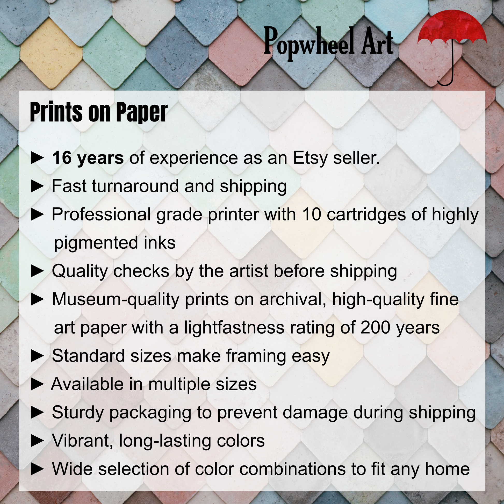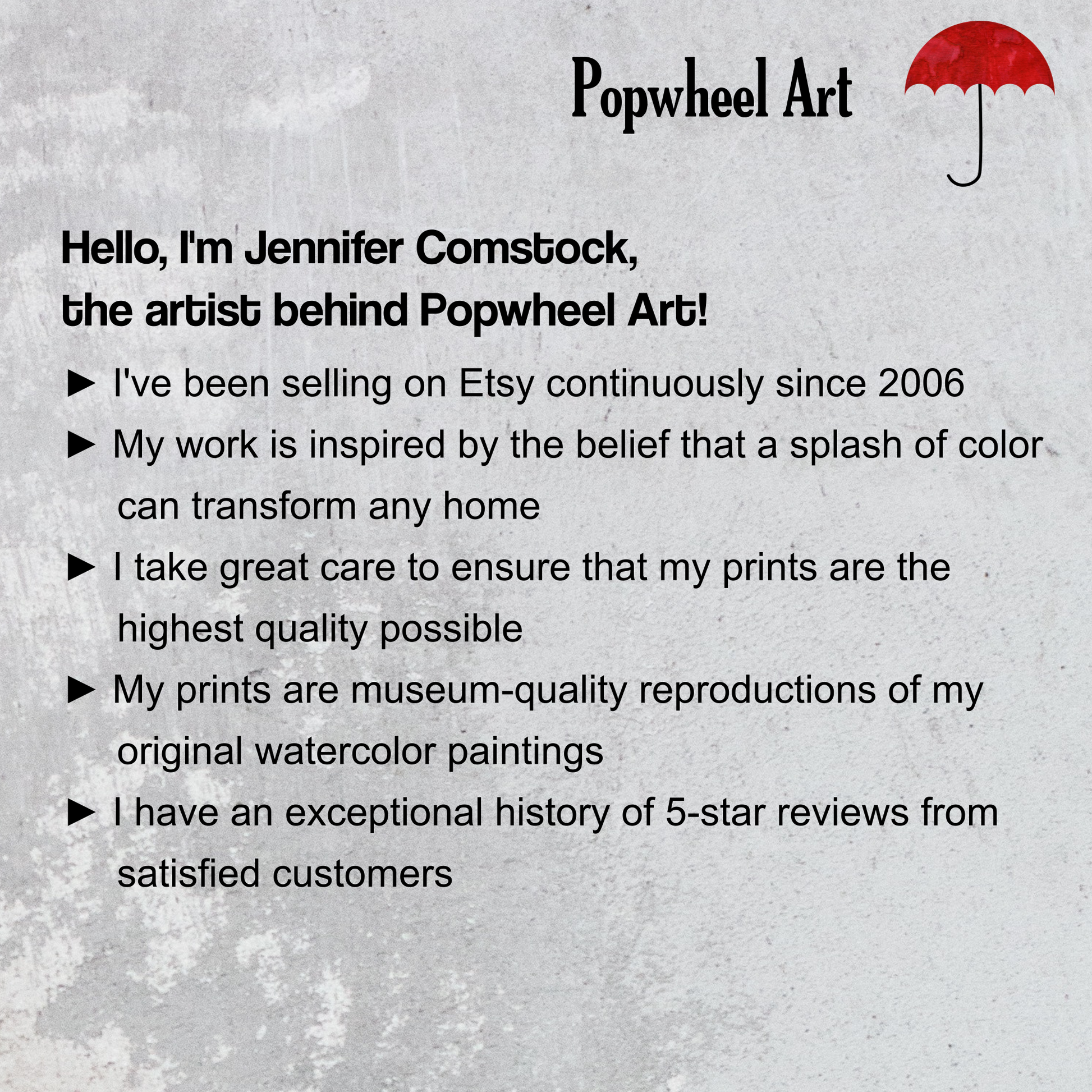 This is a fine art print of my original watercolor painting and depicts a lime on a purple background. I love the vibrancy of the colors in this piece. This is a museum quality piece that has been printed on a professional grade printer in my studio. The colors are vibrant and the details are so fine--it really has the appearance of the original watercolor painting. FAST TURNAROUND I print orders daily and ship your order the next business day to ensure it arrives to you as quickly as possible. BANISH BORING WALLS! Brighten up any room with this gorgeous, museum-quality print of my watercolor painting of flowers. Artwork is a simple, affordable way to change the look of a room and is also the perfect way to complete your renovation project or add an artistic finishing touch to your freshly painted walls. If you’re looking to add vibrant colors, this floral print will fit in perfectly. I also have many color-combinations in my shop to suit many color schemes PopwheelArt.etsy.com ART MAKES A GREAT GIFT This beautiful watercolor print of flowers is the perfect gift for your mom, sister or any friend who likes to decorate with flowers or enjoys gardening. This print makes a wonderful gift for mother’s day, birthday or housewarming. A unique alternative to buying a live flower bouquet. STANDARD SIZES MAKE FRAMING SIMPLE Available in multiple sizes: 5x7, 8x10, 11x14, 14x18, 16x20 (see drop-down menu to make your selection). These are the sizes of readily available store-bought picture frames and mattes. They are ready to pop into your favorite frame with or without a mat. These are also easy sizes for frame shops to work with if you prefer. The sizes listed are the actual dimensions of the paper–they have a small white border to allow for matting. MUSEUM QUALITY MATERIALS : PRINTED BY THE ARTIST I don’t outsource any of my fine art prints on paper. I print each one at a time after you have placed an order. This allows me to do quality checks on every art print as I package it before I send it to you…and I am very picky. These flowers have been printed by me in my art studio using a professional-grade large format printer. This allows me to print at a much higher resolution than a typical home photo printer. It uses 10 cartridges of highly pigmented inks. The finished print has a lightfastness rating of 200 years as long as it is kept out of direct sunlight. This image is printed on 260gsm thick and velvety fine art paper that is 100% cotton rag. This is a specialty printing paper and is archival. I selected this particular paper because it is a fresh white that allows the colors to pop and I love the heavy weight and subtle textured matte finish. It has the vibrancy and fine detail even up close. This is a true museum quality art print. Each print is hand signed on the back and initialed on the front. I package each print in a clear plastic sleeve with a chipboard backing. Your order is shipped carefully and secure in a non-bendy photo mailer. U.S. Shipments: I ship all of my prints flat and not rolled up in a tube. International Shipments: for prints that are 14x18 and up are carefully shipped in a tube in order to keep shipping costs down because this is considered an oversized package. I am more than happy to ship flat for an additional fee. Contact me for further information.
